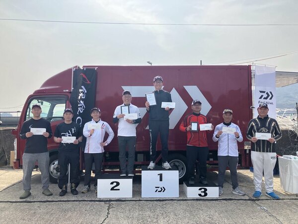 笠岡周辺はまだそれほど水温が上がってないので底近くをきっちり攻めた選手にチヌが食ってきたようである。つけエサのコマセの色も影響しているようで選手はつけエサを変えるなど苦労しながらの釣りとなった。大会結果としては約70%近くの選手が検量に持ち込み、入賞者全員が5尾をキープするなど魚影の濃さを見せつけられ検量は大いに盛り上がった。6kg以上が3名、5kg以上も5名など、さすが銀狼カップに出場する選手たちは技術は高く、ハイレベルな熱戦が繰り広げられた。見事に6,216gの釣果の古江選手が優勝、同じく6kgオーバーの土田選手が準優勝となった。
