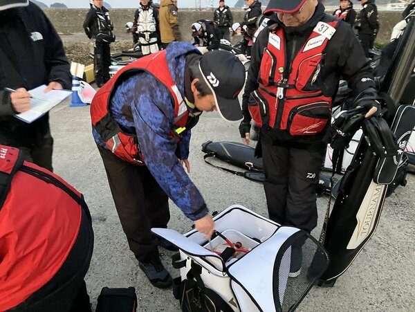 ゼッケン番号の大きい順に整列したら各選手のバッカンチェックとクーラーチェックを役員が実施します!ご協力をありがとうございます。