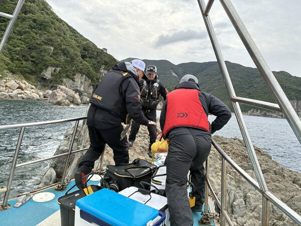 甑島までの時間が長く、船の揺れがきついこともあるので、ロッドケースや道具は船倉に仕舞います。選手の皆さんのご協力に感謝します。