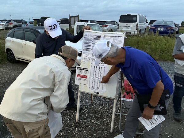 ブロック大会出場者決定戦の釣り座抽選を行っています。「ブロック大会には参加可能ですか?」確認も行われています。
