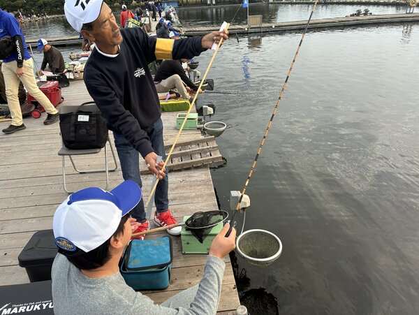 つり処椎の木湖ではタナ規定「ウキから第一オモリまで1m以上」があります。審判が1mの棒で仕掛けの長さをチェックしています。